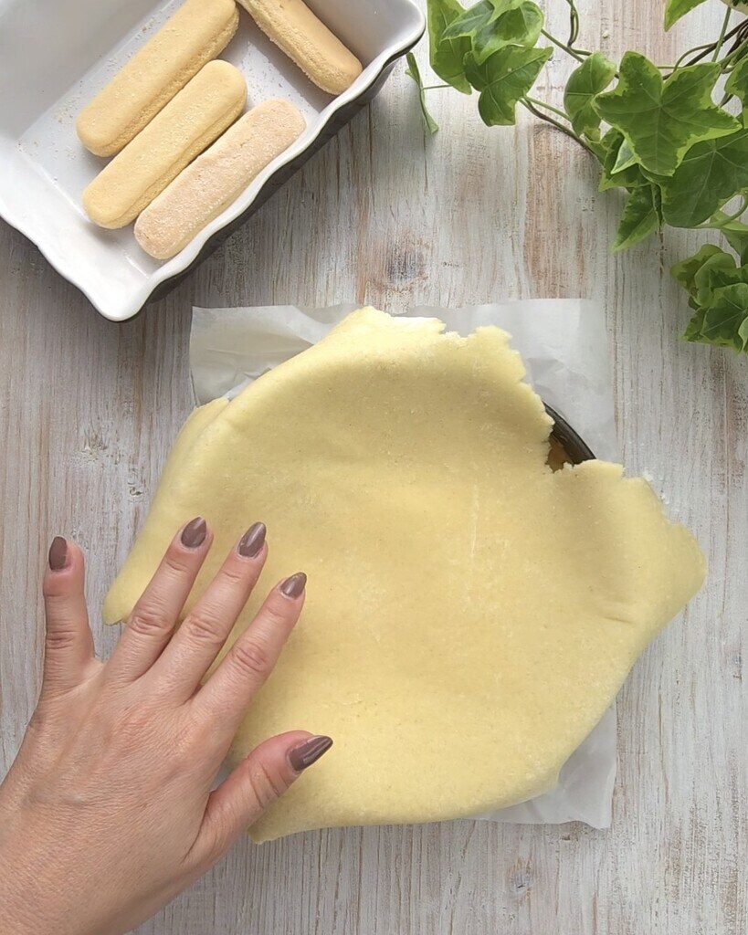 Rol twee schijven uit, en met het eerste uitgerolde deeg bedek je een springvorm van 22-24 cm, die eerder is ingevet en bestoven met bloem.