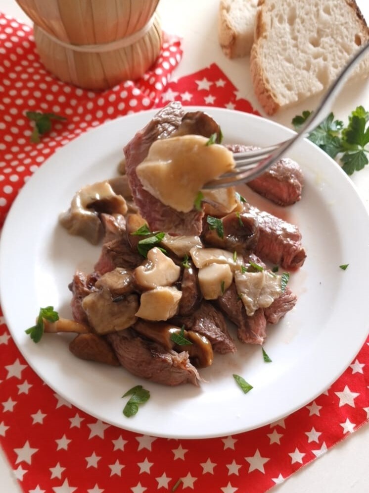 De tagliata met champignons wordt het beste meteen gegeten als het nog warm en dampend is.