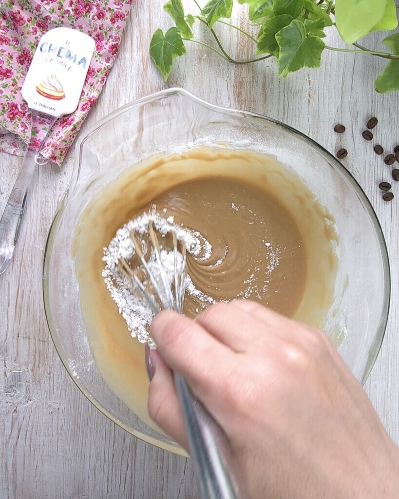 Mix goed met een elektrische mixer gedurende ongeveer 5 minuten of totdat de eieren schuimig worden. Ga door met de mixer en voeg de olie en koude koffie toe.