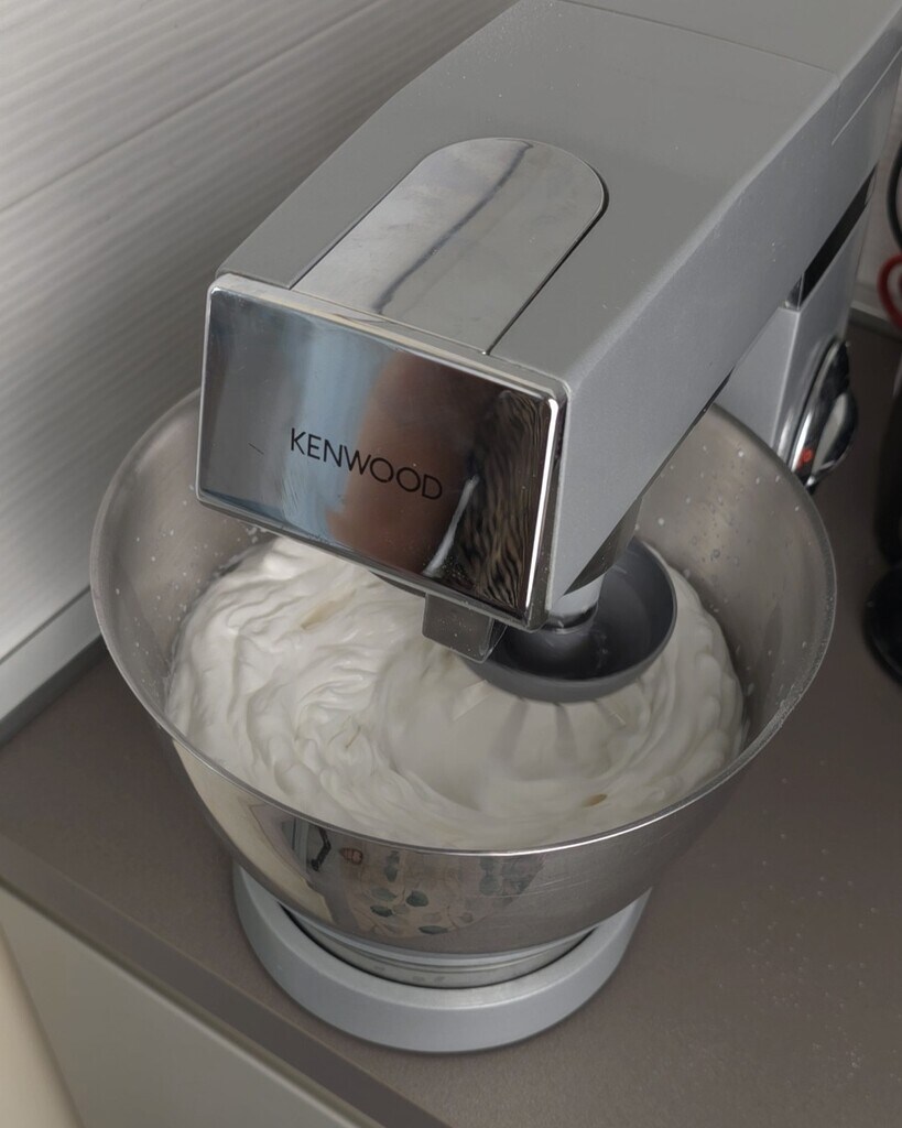 Ondertussen giet je de koude melk uit de koelkast in de mixer, voeg dan de dolceneve toe en begin te kloppen, dit duurt ongeveer 5 minuten.