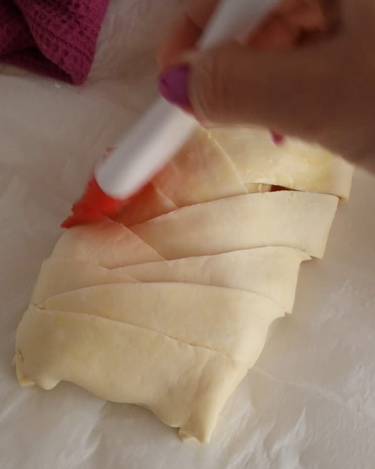 Vouw nu elke strook van het deeg van de lange kant om en sluit de randen goed af.