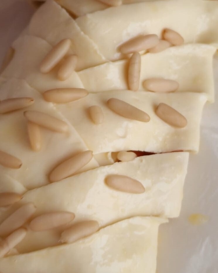 Bestrijk de bovenkant met melk. Versier met het geklopte ei en de pijnboompitten als laatste stap.