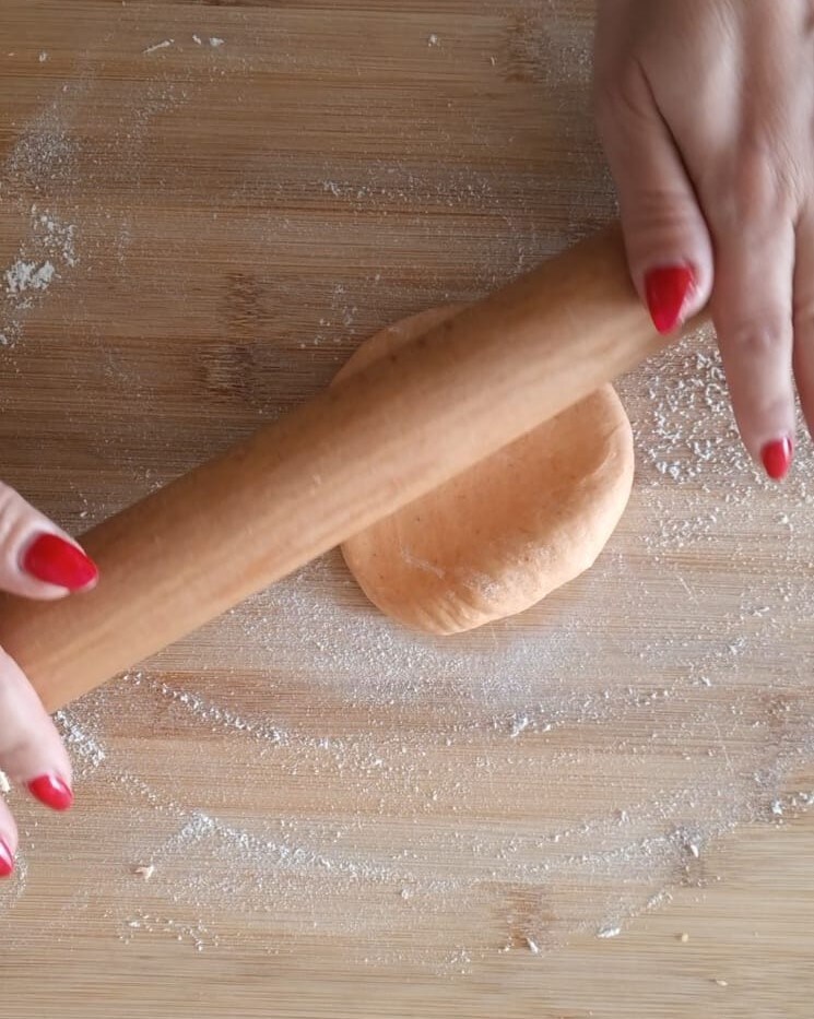 Na de rusttijd verdeel je het deeg in 4 bolletjes, rol ze daarna plat met een deegroller en vul ze met de scamorza.