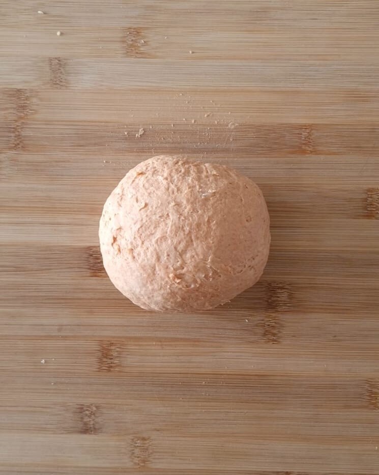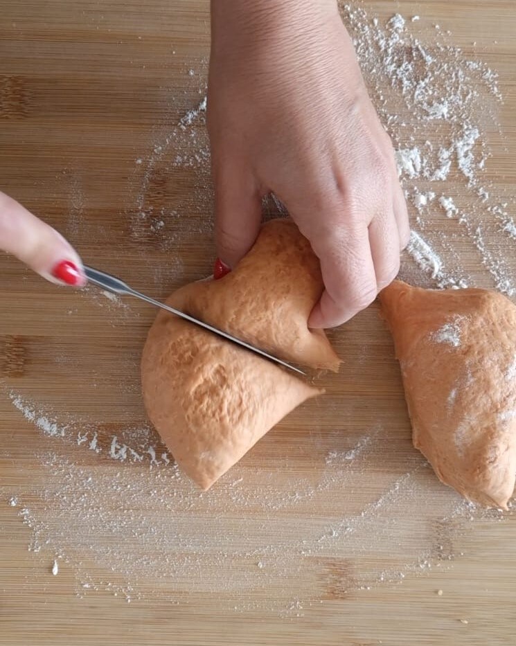 Voeg op dit punt de bloem en de tomatenpuree toe. Kneed tot een glad en zacht deeg.