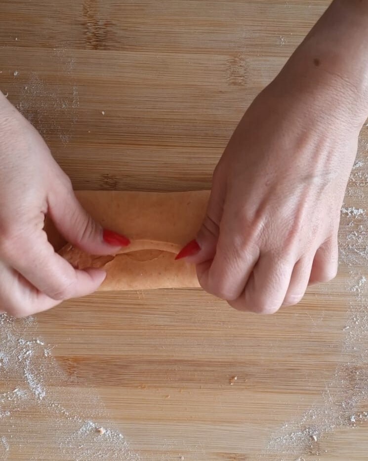 Vouw als een pakketje en druk goed aan met een deegroller.