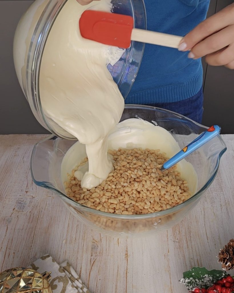 Smelt de witte chocolade en meng het met de gepofte rijst, voeg dan de witte chocoladepasta toe en meng goed, voeg ook de in stukjes gebroken Kinder repen toe en meng opnieuw tot je een homogeen mengsel krijgt.