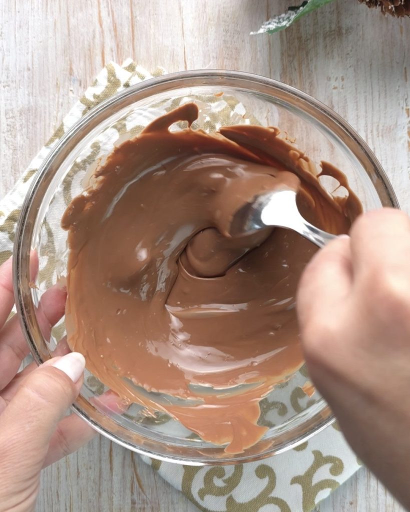 Verdeel de gesmolten chocolade in de vorm en verwijder het teveel met een kwast. Laat het in de koelkast rusten.