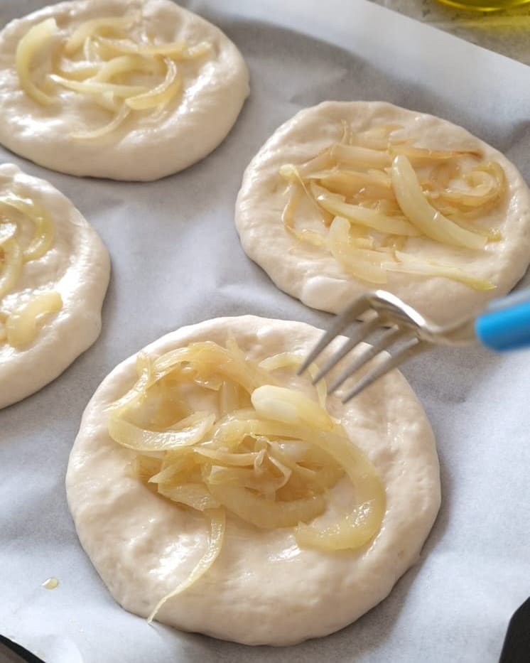 Neem de focaccine en beleg ze met de ui en een scheutje olijfolie. Bak op 200°C gedurende ongeveer 15 minuten.
