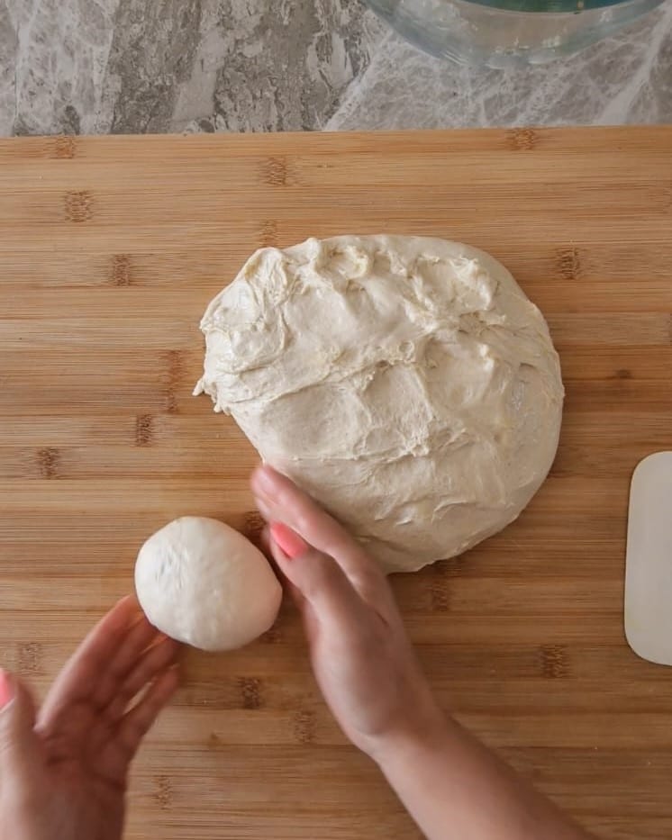 Na de rusttijd, maak kleine bolletjes van ongeveer 130g elk, laat ze 30 minuten rijzen, goed bedekt en op enige afstand van elkaar.