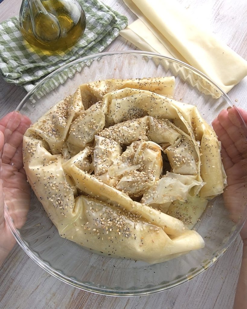 Bestrijk het oppervlak met de melk en het ei en decoreer met de zaden. Bak op 190°C gedurende ongeveer 20 minuten. De burek is klaar wanneer je een goudbruine en knapperige korst ziet.