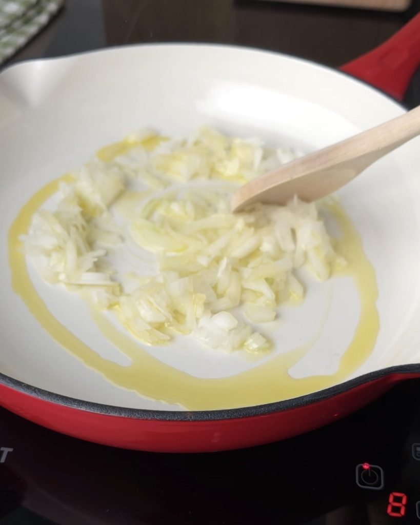 Hak de ui fijn, bak in een pan met een scheutje olijfolie tot het zacht is.