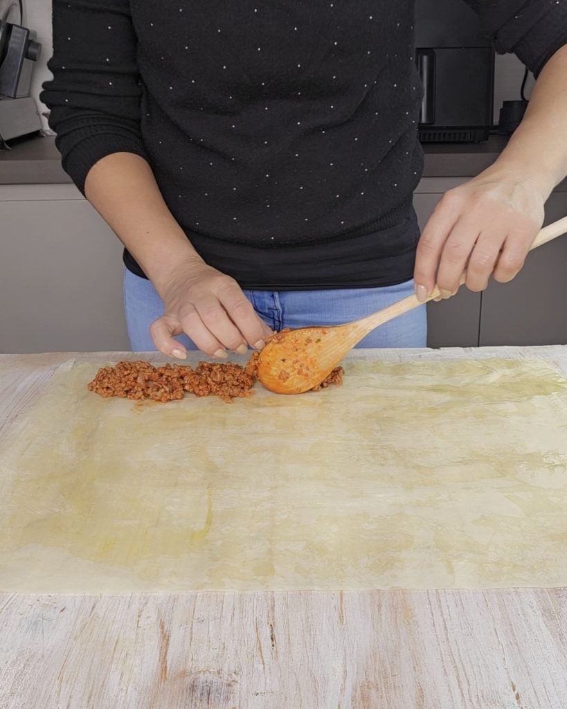 Leg op dit punt het vlees langs één kant van het filodeeg (zorg ervoor dat je niet te dicht bij de buitenrand komt).