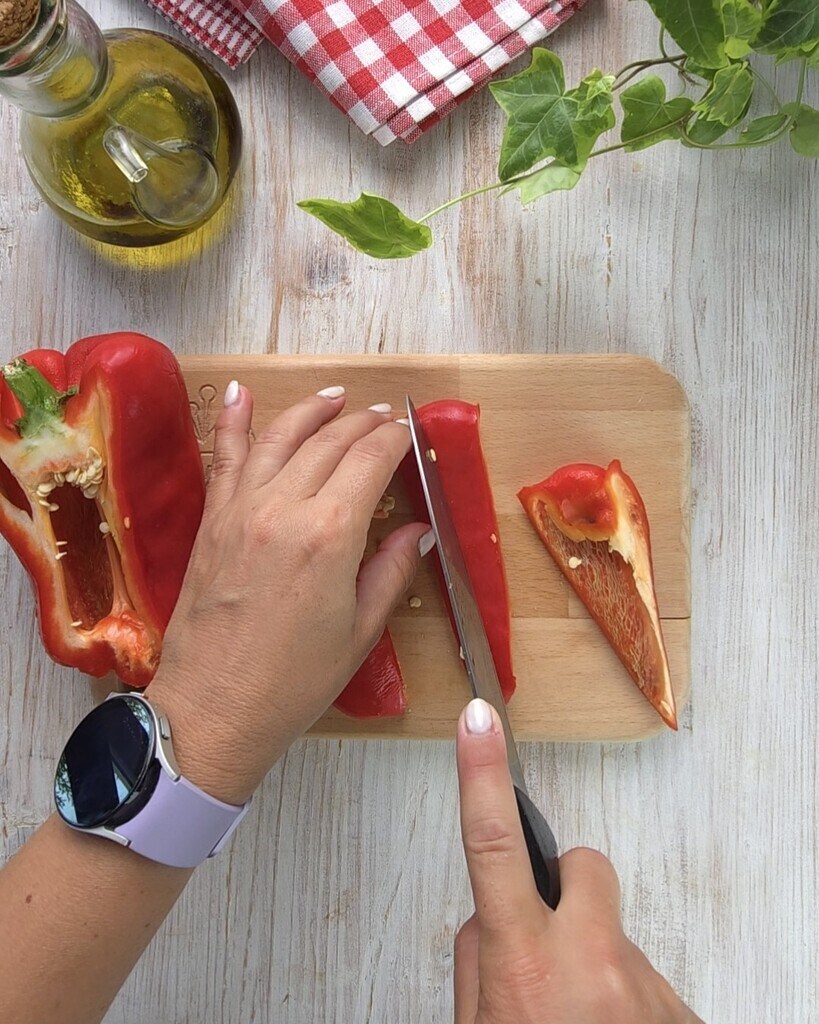 Was alle groenten grondig, snijd vervolgens de paprika’s in stukjes en verwijder de hardere delen, verdeel ook de uien, wortelen en tomaten in stukjes.