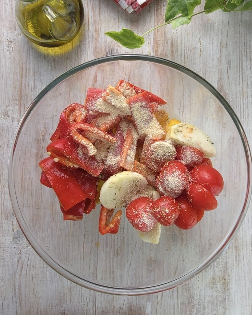 Doe alle groenten in een grote kom en breng op smaak met olie, kruiden en paneermeel, goed mengen.