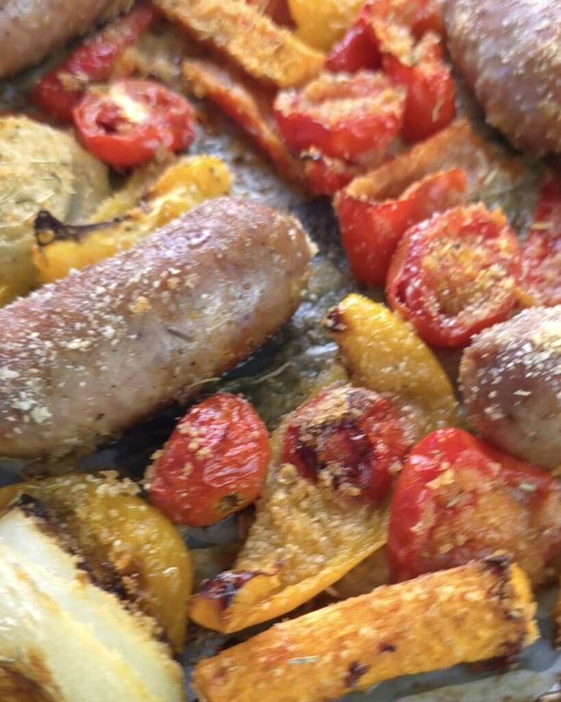 Bak in de oven op 190°C gedurende ongeveer 30 minuten. Als je ziet dat de worst te snel gaart, haal deze dan uit de oven en laat de groenten nog 5 minuten grillen. Haal uit de oven en serveer warm!