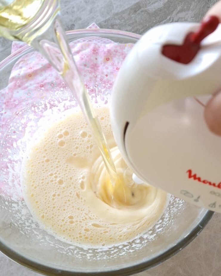 Giet vervolgens de olie in een dun straaltje en daarna de yoghurt terwijl je blijft mengen tot je een goed gemengd beslag hebt.