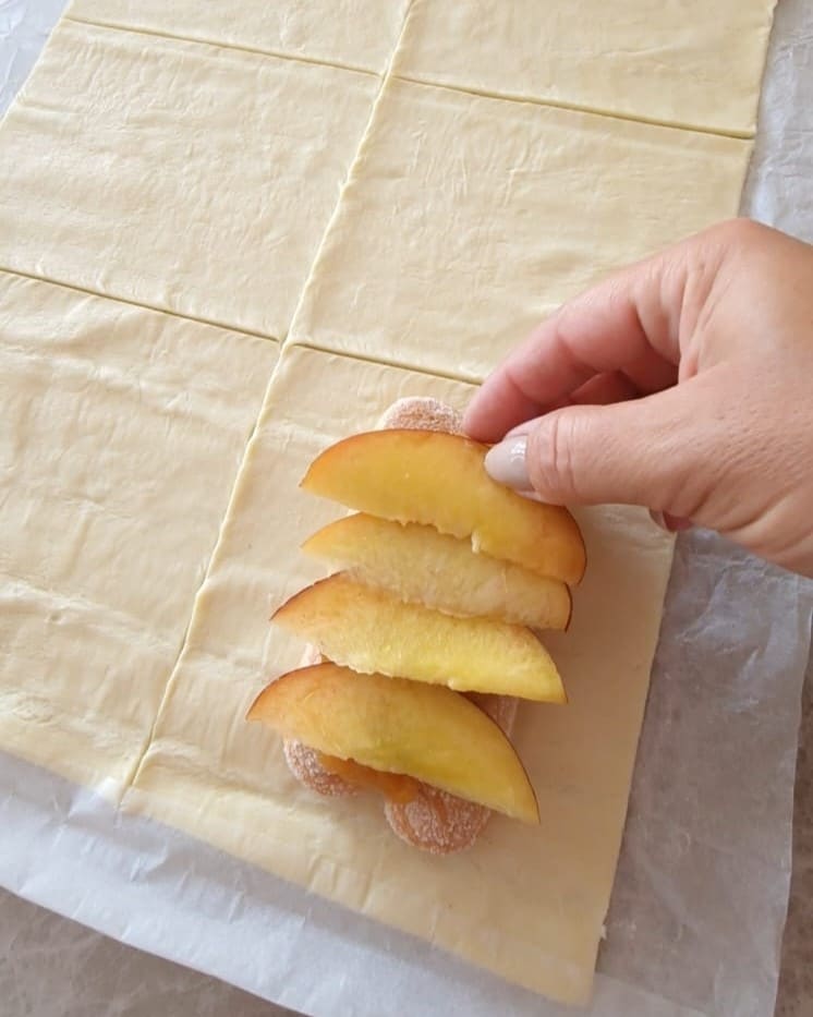 Ga verder met de vulling door de jam en de in dunne schijfjes gesneden perziken toe te voegen. Sluit ten slotte de randen van elke rechthoek, waardoor een zakje ontstaat.