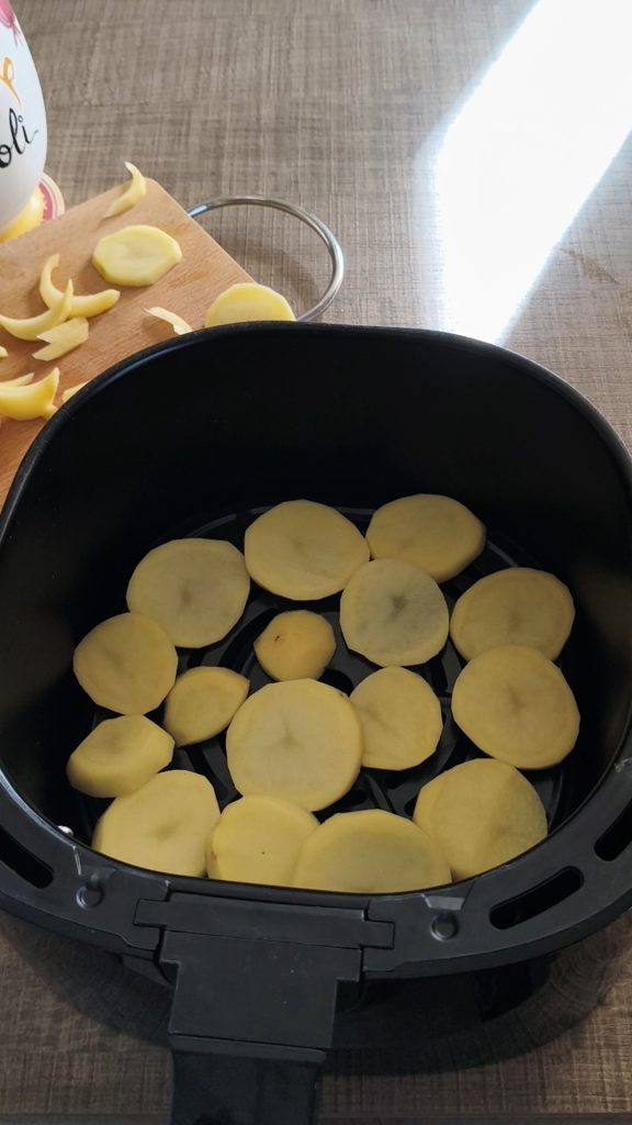 Was, schil en snijd de aardappels niet te dun en leg ze, zonder ze te overlappen, in het mandje van de airfryer.