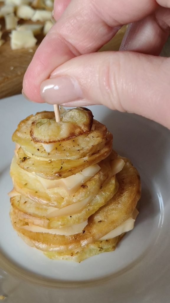 De aardappels worden in dunne plakjes gesneden en in de airfryer gedaan voor knapperigheid, daarna worden ze met tandenstokers in de vorm van een boompje gestapeld. Tussen elke plak een beetje smeuïge scamorza om alles samen te binden, terwijl een snufje Parmezaanse kaas en wat roze peperkorrels het gerecht compleet maken met smaak en kleur.