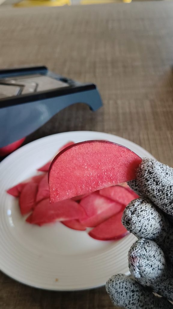 • Snijd de andere appel met schil; met de mandoline krijg je een homogeen en perfect resultaat.