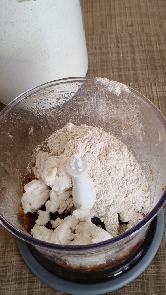 Als laatste, voeg het bakpoeder en de hazelnootsnippers toe. Blend tot alle ingrediënten goed gemengd zijn. Zet het een half uur in de koelkast; dit hangt erg af van hoe zacht het einddeeg is.