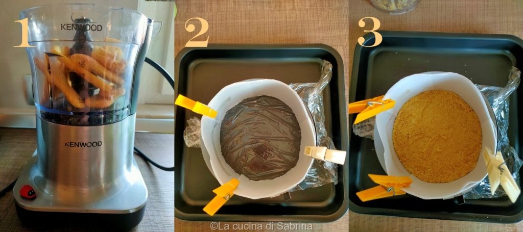 – 2 Bekleed de bodem van de ring met huishoudfolie en de wanden met bakpapier, op maat gesneden en 3 giet het mengsel op de bodem; druk aan met de achterkant van een lepel of een vleeshamer en zet 10′ in de koelkast
