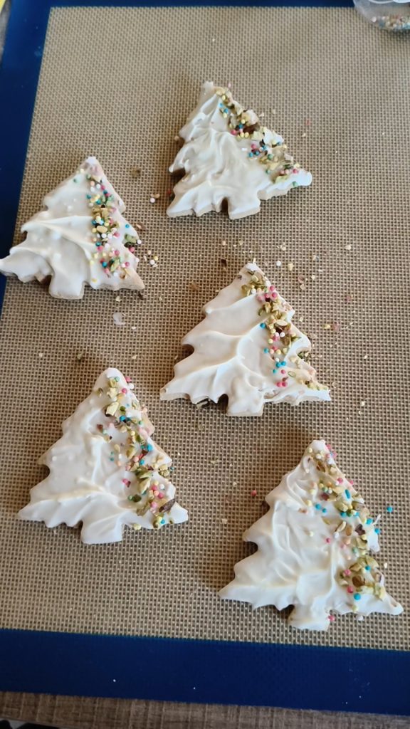 De kerstboompjes zijn ideaal als eetbare plaatskaartjes, om in de boom te hangen of als zelfgemaakte cadeautjes. Het contrast tussen het kruidige deeg en de zoetheid van witte chocolade maakt ze onweerstaanbaar, en je kunt ze versieren met wat je maar wilt: notencrunch, suikerparels, of minimalistisch laten.