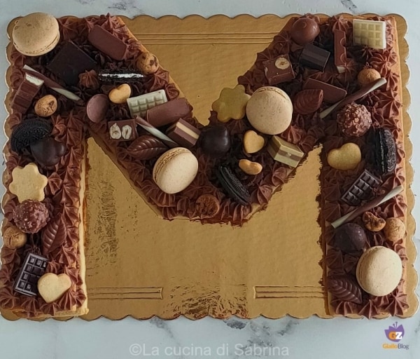 • Nadat je het zanddeeg tot een dikte van ongeveer 5 mm hebt uitgerold, plaats de kartonnen sjabloon en snijd de vorm uit; om te voorkomen dat het breekt, kun je ook 2 helften van de M uitsnijden en deze vervolgens samenvoegen met een stuk deeg (alle onregelmatigheden zullen verborgen worden door de decoraties).