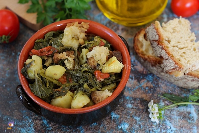 Het recept van de pancotto sanseverese is een van de traditionele boerengerechten van mijn stad, gebaseerd op oud brood, veldgroenten en aardappelen, op smaak gebracht met een royale scheut extra vergine olijfolie.