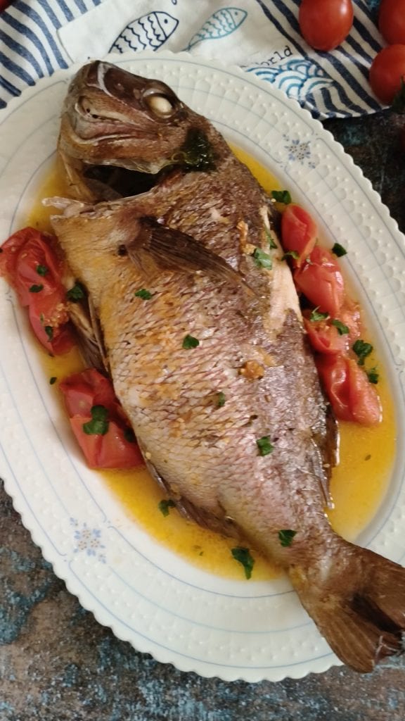 Serveer de dorade op een serveerschaal met de jus, de tomaten en wat vers gehakte peterselie. Of als je wilt, fileer het eerst en serveer.