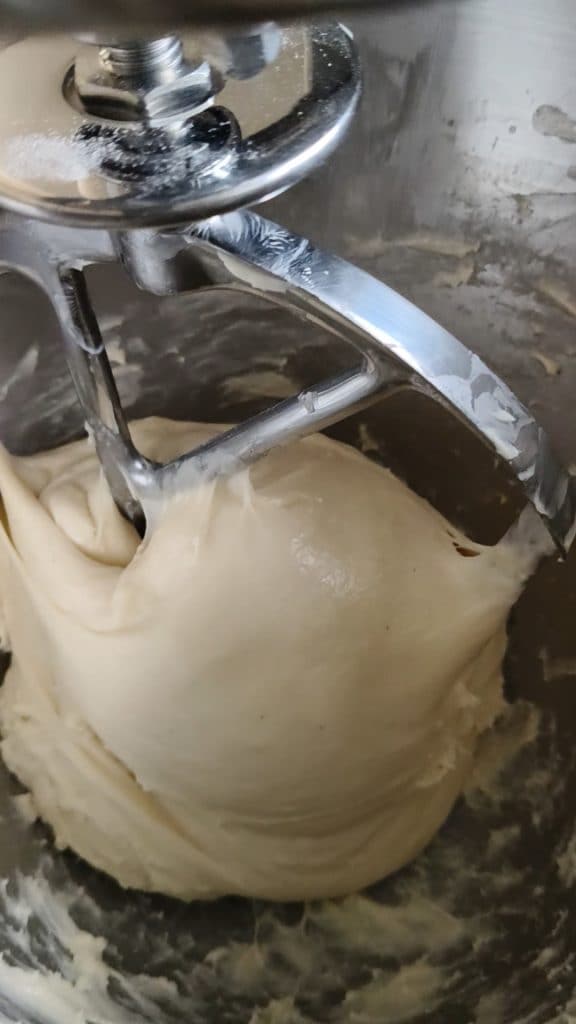 Doe de poolish met het water in de kom van de keukenmachine en geef een paar omwentelingen met de platte klopper om het te hydrateren. Voeg dan de eerste eidooier toe, gevolgd door een deel van de bloem en de helft van de suiker en kneed.
