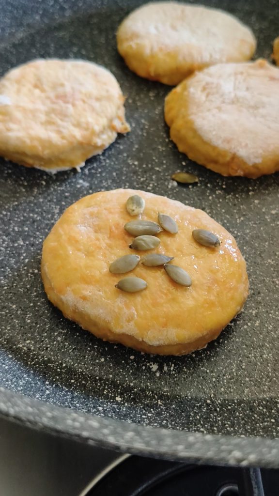 • Vet de pan lichtjes in met olie en plaats de broodjes erin. Bestrijk het oppervlak met een beetje olie als je wilt decoreren met pompoenpitten; dek af met een deksel en bak ongeveer 4 minuten aan elke kant.