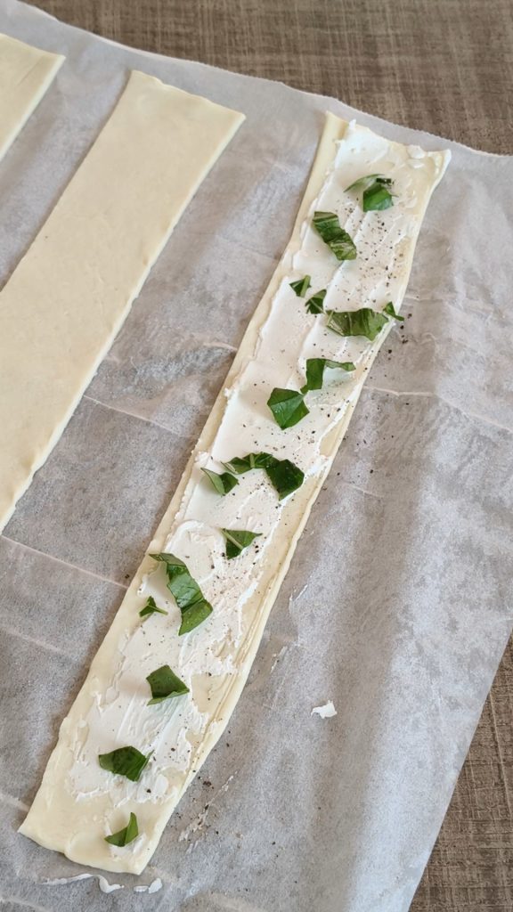 Rol het bladerdeeg uit en snijd 4 stroken van de lange zijde. Smeer een laagje smeerkaas op elke strook. Kruid met grof gescheurde basilicumblaadjes en versgemalen zwarte peper.