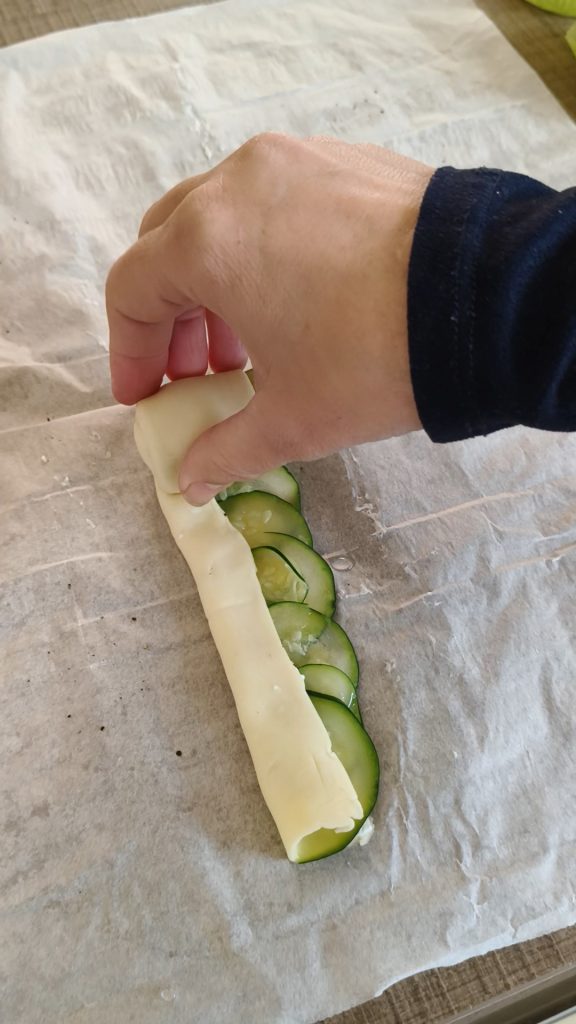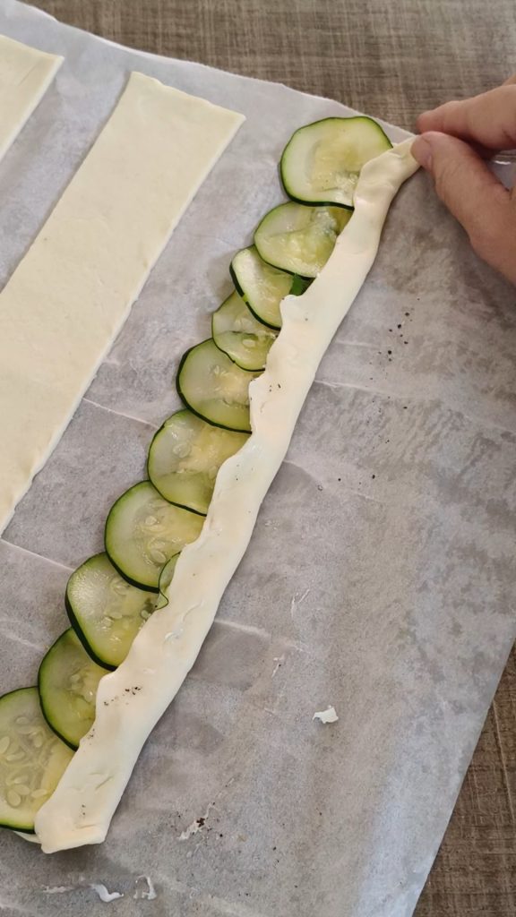Leg de courgetteplakjes overlappend over de gehele lengte van elke strook en vouw de onderste rand van het deeg over de plakjes.