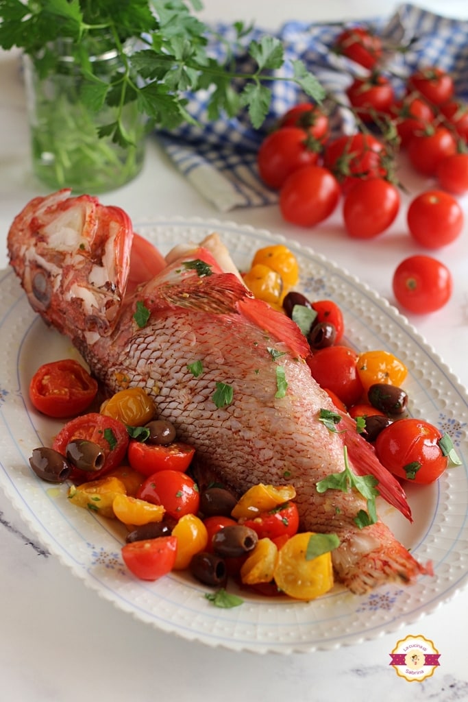 Dus, in dit geval, na het schoonmaken van de vis (een operatie die ik aanraad in de viswinkel te laten doen, omdat de stekels van de rugvin, groot en robuust, naast het bevatten van giftige klieren, echt moeilijk te snijden zijn; en vervolgens moet de vis ook nog ontkomt worden), wordt de vis in de ovenschaal gekruid met de tomaten, de olijven en enkele andere ingrediënten en gedurende minimaal 40 minuten gebakken, hoewel dit uiteraard afhangt van de grootte.
