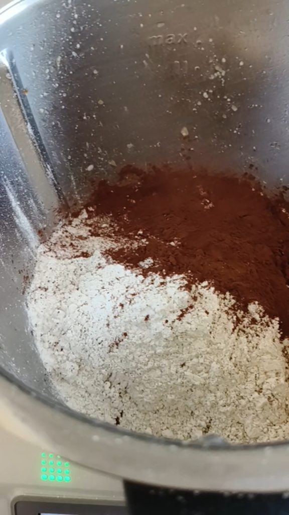 Giet de meelsoorten en de cacao erbij, 30 sec/vel 4, voeg daarna de olie en het zout toe, 2 min/ vel Spiga.