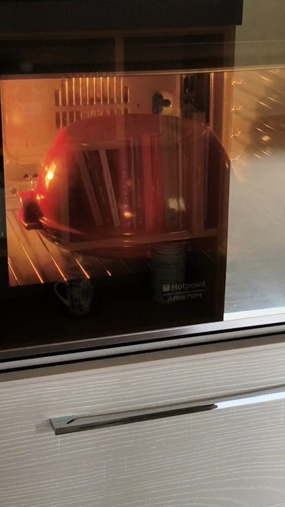 Verwarm de oven tot 200°C met de pan voor het brood erin. Zodra de gewenste temperatuur bereikt is, plaats je het brood op de bodem, maak je een insnijding, sluit je met het deksel en zet je in de oven.
