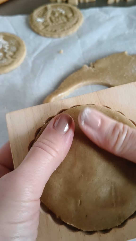 Voor het perfecte resultaat van de koekjes moeten de houten versierde vormpjes koud zijn. Het is daarom handig om ze 10/15 minuten in de vriezer te houden en dan te bestrooien met een beetje bloem en het teveel af te schudden.