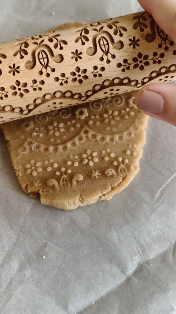 Als je geen houten vormpjes hebt, gebruik dan een decoratieve deegroller, rol het deeg altijd uit tot 3 mm, laat het 10 minuten in de koelkast en rol er dan weer overheen met de decoratieve deegroller.