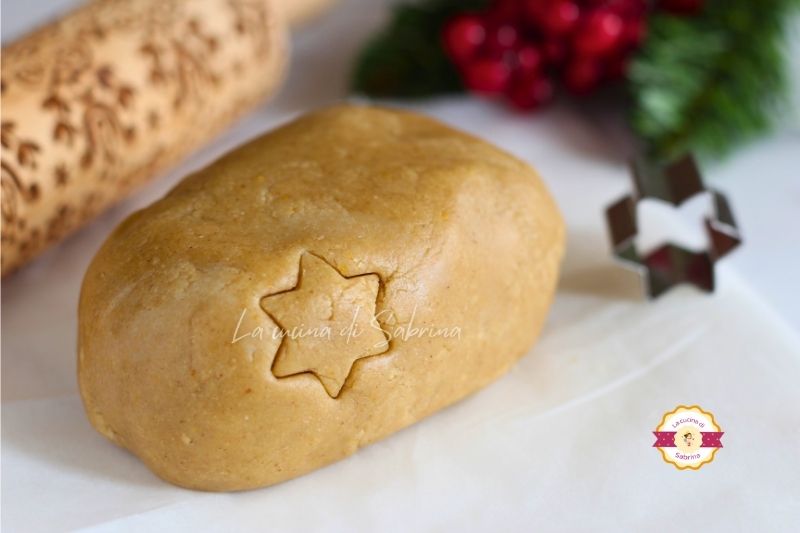 Maal de bruine suiker met de sinaasappelschil, giet het in een kom of op het werkblad en voeg de koude boter in stukjes toe. Werk met de vingertoppen een paar minuten en voeg het ei toe (liefst lichtjes geklopt). Werk nog twee/drie minuten met de vingertoppen en voeg ten slotte alle poeders toe en druk het deeg samen zonder het te verwarmen. Laat het vervolgens rusten in de koelkast.