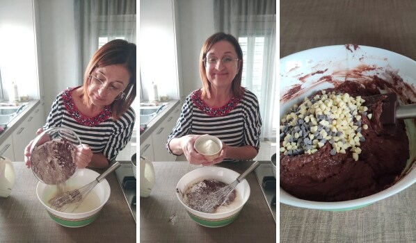 – Giet de droge ingrediënten bij de vloeistoffen; voeg het kokosmeel toe en meng kort (met een handklopper of een elektrische mixer). Voeg tenslotte de chocoladedruppels toe.