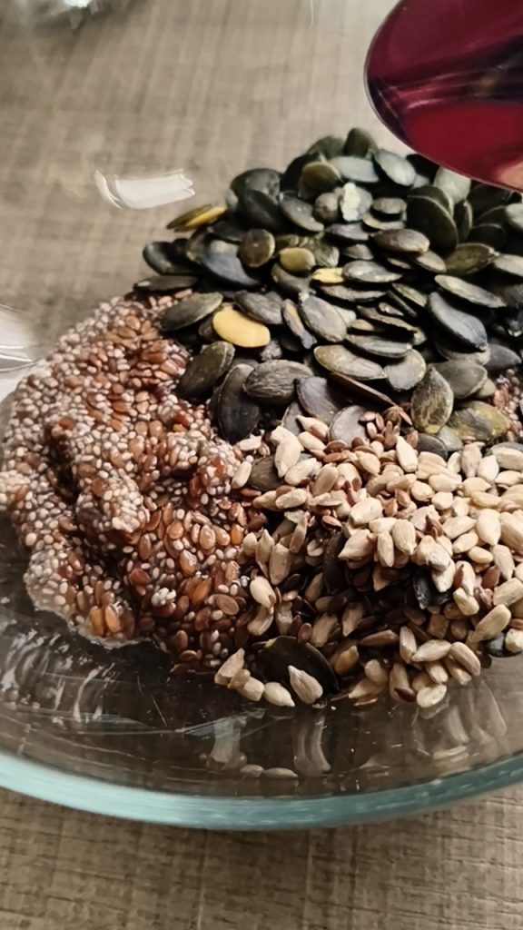 Leg lijnzaad en chiazaad circa 15 minuten in het water; ze moeten al het water opnemen en gelachtig worden.