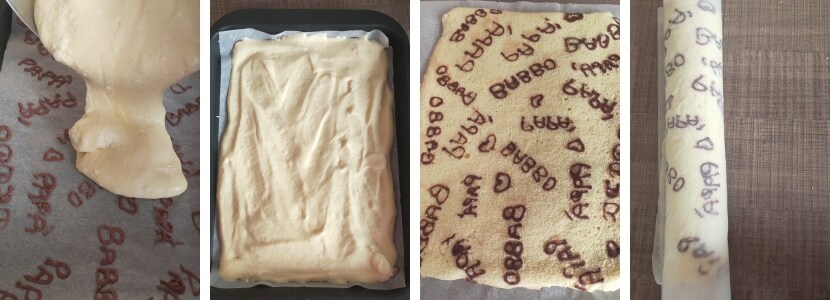 – Giet het mengsel over het bevroren sigarettendeeg, strijk voorzichtig glad en bak in een voorverwarmde oven op 170°C gedurende ongeveer 10′. Draai vervolgens het gebakken biscuitdeeg om, verwijder voorzichtig het bakpapier en rol het op met een schoon vel bakpapier.