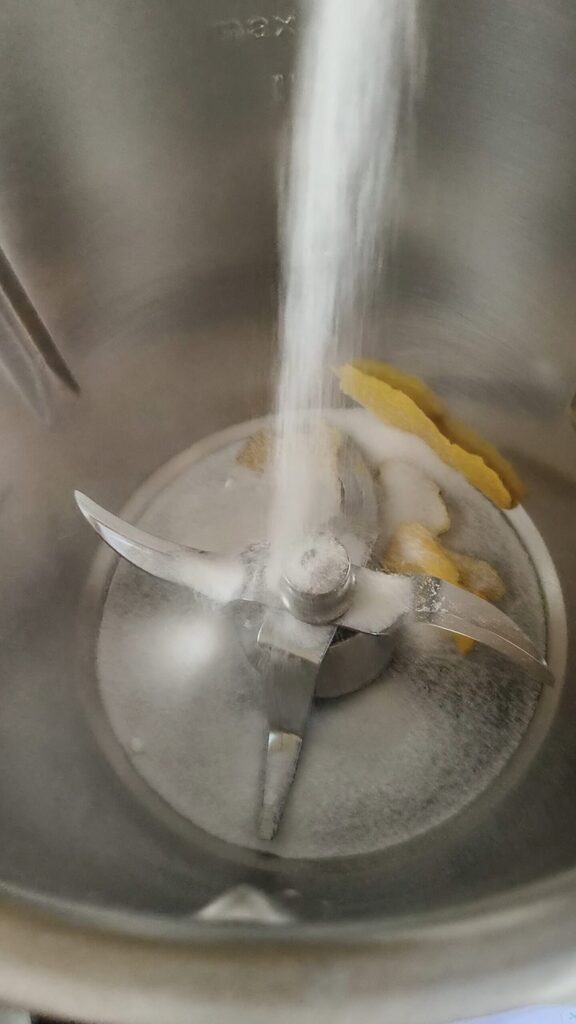 Doe de suiker en de citroenschil in de kan: 10 sec. snelheid 10.
