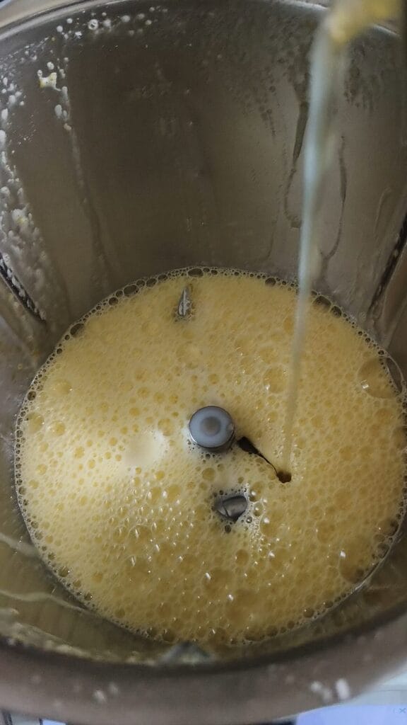 Giet de rijstolie en de melk erbij: 30 sec. snelheid 4.
