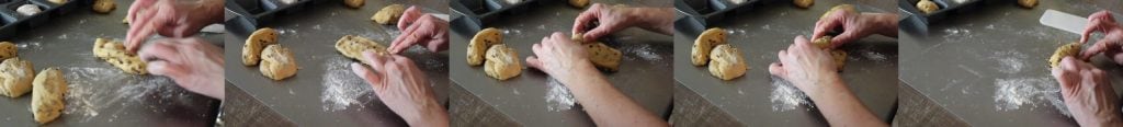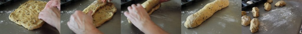 – Breng het deeg over op een licht met bloem bestoven werkblad en rol het voorzichtig uit met de vingertoppen. Rol het op tot een cilinder en snijd stukken van ongeveer 100 g elk.