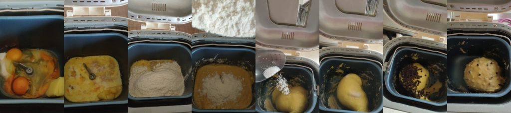 Giet in de kom van de broodbakmachine, zachte boter, eieren en suiker; start de kneedmodus en voeg na een paar slagen de gist, de melk en 300 g bloem toe.