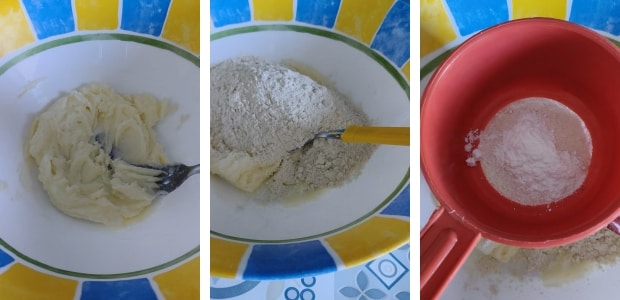 -Bereid het deeg door in een kom met een vork (of een houten lepel of een mixer) de boter met de resterende suiker te mengen. Voeg de reeds gezeefde bloem en een theelepel bakpoeder toe en begin te mengen.