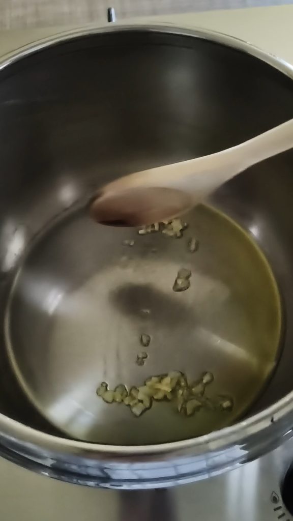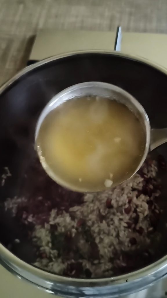 Giet ongeveer 3 soeplepels hete vleesbouillon (het moet de rijst bedekken); sluit het deksel, breng de pan onder druk en reken 6 minuten vanaf het fluitsignaal.
