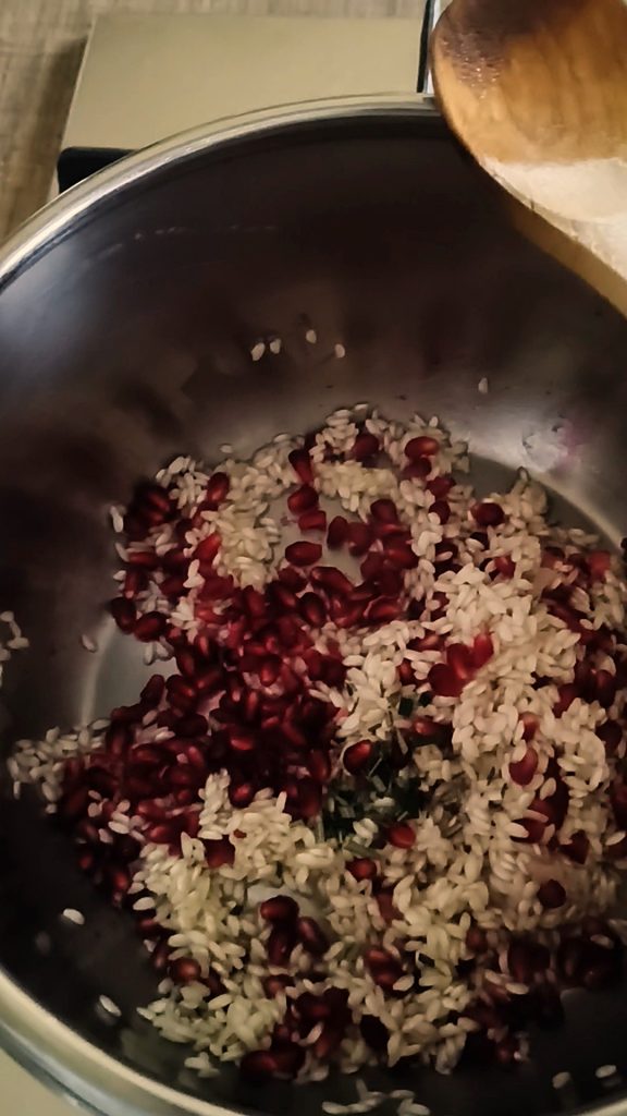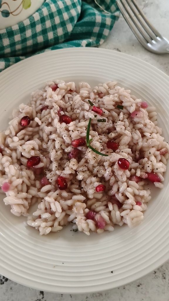 De risotto met granaatappel in de snelkookpan is een eenvoudig, snel en spectaculair recept, perfect voor speciale gelegenheden zoals Kerstmis en Oudejaarsavond: de granaatappelpitten, die naast een heldere kleur geven, zijn een symbool van geluk en voorspoed. Dankzij de snelkookpan duurt het koken slechts 6 minuten na het fluitsignaal, wat resulteert in een romige, glanzende en perfect gekookte risotto zonder urenlang aan het fornuis te staan.